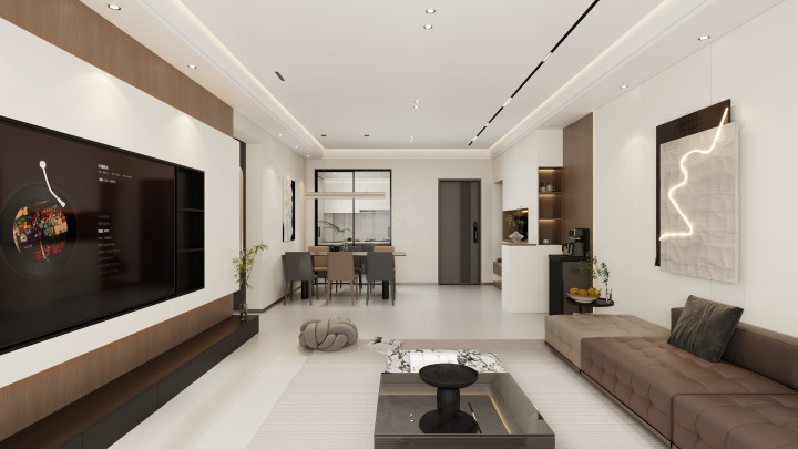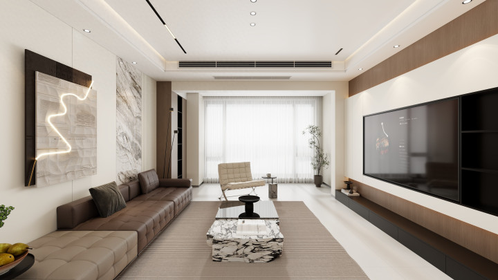 巨幕电视墙科技感拉满,棕色皮质沙发软乎乎得像块巧克力,大理石纹理茶几艺术感爆棚,角落小绿植与灯光互动,追剧、聊天快乐都能翻倍~