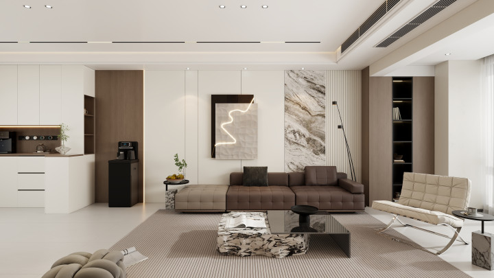 奶白色单椅像朵优雅的云,棕色沙发与大理石元素碰撞出轻奢感,坐下来就不想起身~