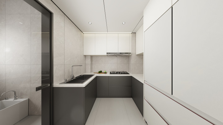 灰白撞色橱柜利落又干净,蜂窝大板+筒灯的组合高级感十足,下厨都变成超有仪式感的创作~