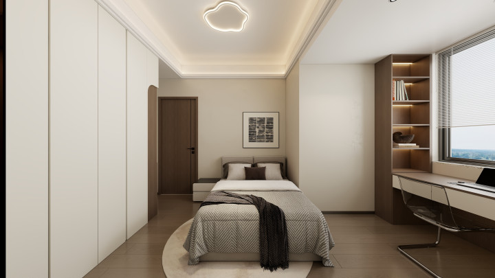 窗边书桌既藏着书香,又能承载工作的专注,阳光透过百叶窗溜进来,待在这里,连呼吸都透着松弛~