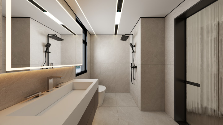 浅灰瓷砖让整个空间泡在柔和里,在这里洗漱、沐浴都成了沉浸式享受~