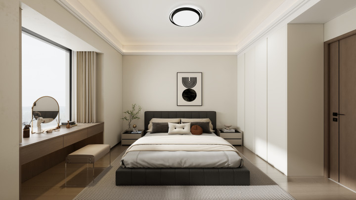 深灰床头像沉稳的靠山,床品白得像刚揉好的云朵,窗边长长的梳妆台,无一不在透着精致感~