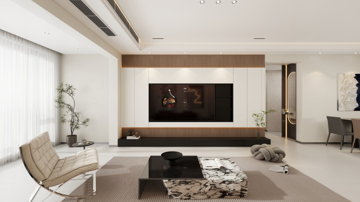 悬浮电视墙设计感十足,角落绿植给空间注满生机,待在这里时光都变得慢悠悠~