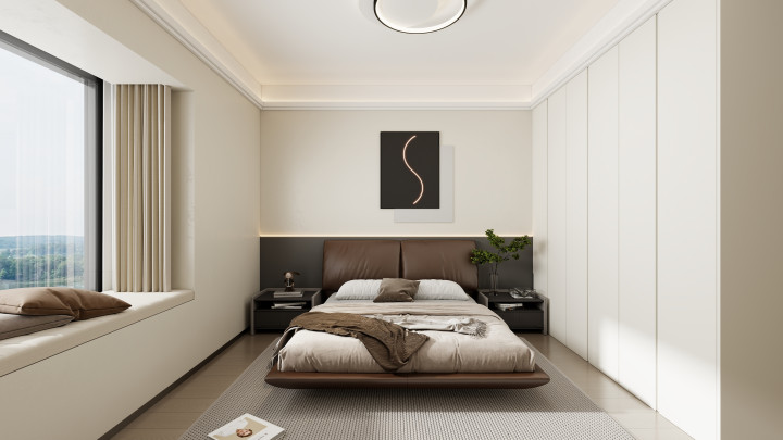 棕色皮质床头透着轻奢质感,床品软乎乎得像棉花糖,墙上艺术画带发光设计,连做梦都像陷在温柔陷阱里~