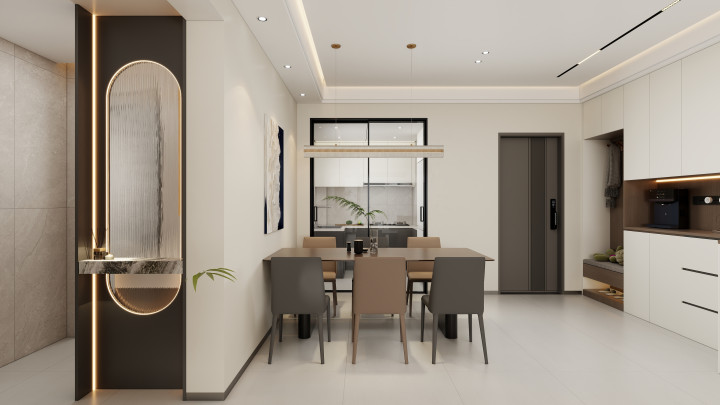 餐厅简约大气,餐椅灰棕配色高级得恰到好处,一家人围坐吃饭,温馨得能融掉所有疲惫~